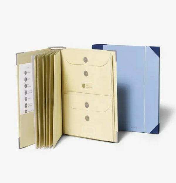 The Folio Document Organizer is the book you’d grab if the house were burning down. A life binder with a set of 10 expandable. resealable envelopes and files of different sizes organize important documents from estate plans to passports to financial records to your favorite recipes.
