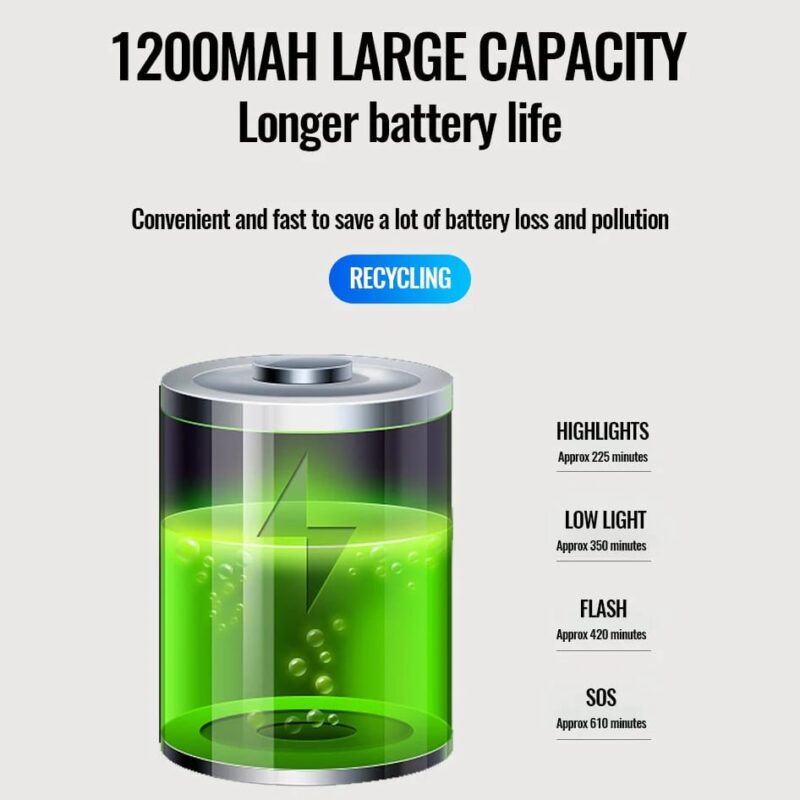 【USB Rechargeable】With Built-in 1200mAh lithium battery.used more convenience .With USB charging port. approx. 225 minutes In Strong Light Mode.